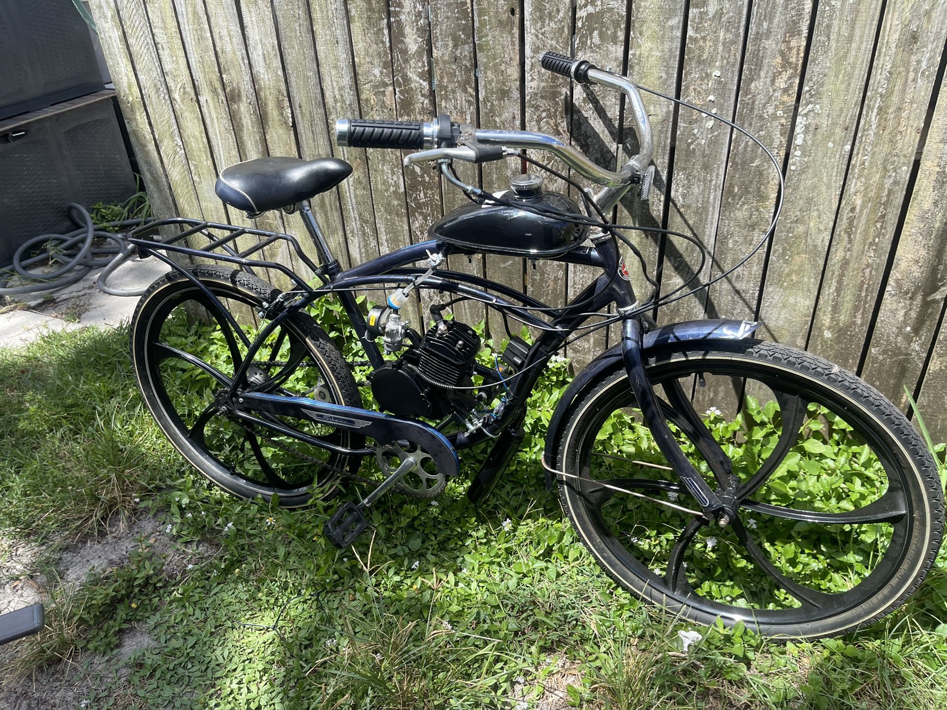 brand new engine on a used schwinn cruiser bicycle, with mag wheels . 30-35mph and 120 mpg.