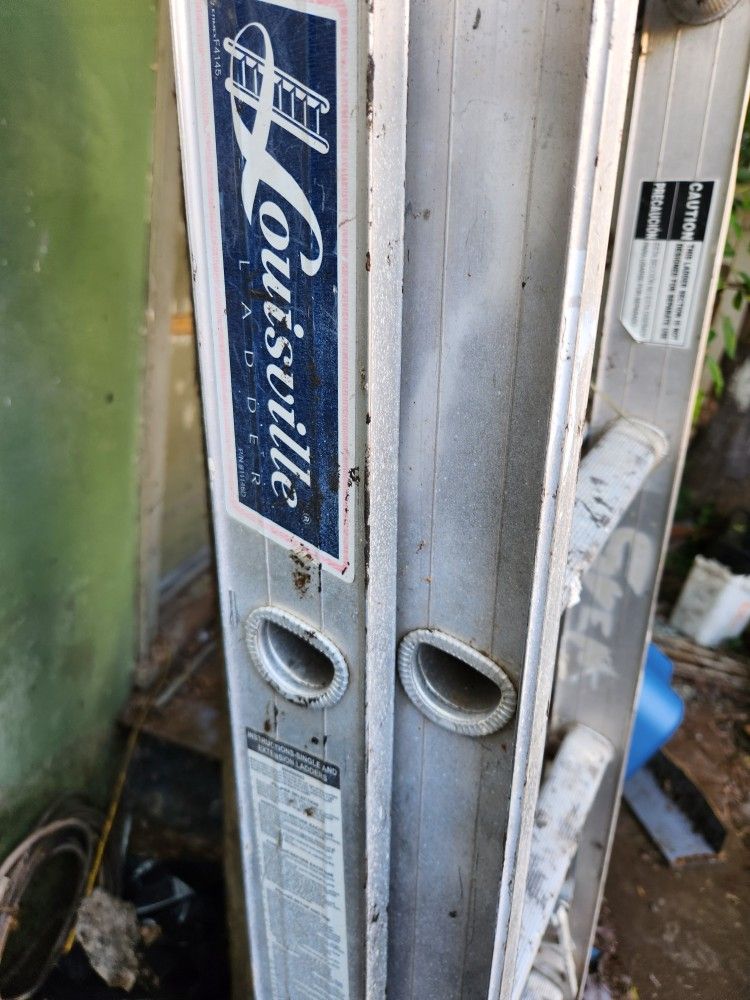 22', 2 section ladder with pivoting feet for hard flat surface or soft ground, missing one catch lever