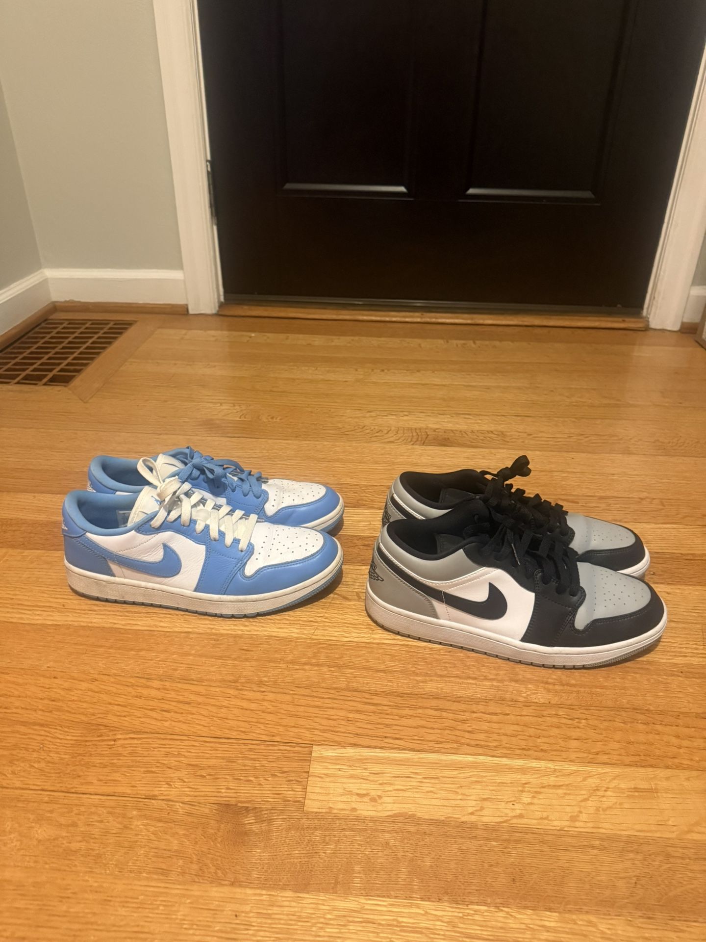 Jordan 1 low shadow size 9 $70 Jordan 1 low Golf shoes size 9 $80 Mismatched laces. Missing extra laces so left shoe has a blue lace, right shoe has a white lace. No box for either Buy both for $120