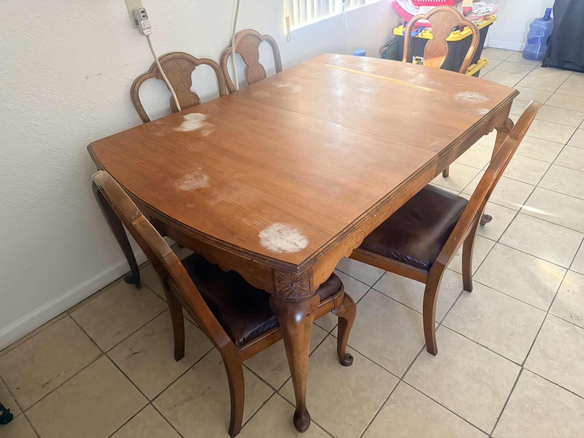 Used table, pretty solid. Has a couple of heat stains on the top. 5 chairs recently upholstered.