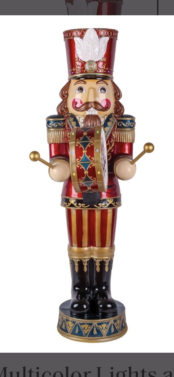 This festooned Bavarian-style Nutcracker figure stands straight and tall with a bass drum strapped to his chest that reads "Merry Christmas" on both sides. Ornate in design, this decorative piece is constructed of durable poly resin materials and features hand-painted detail and a high gloss finish. NEW and still boxed from shipping. Price is for both- Original price was over $700 each.