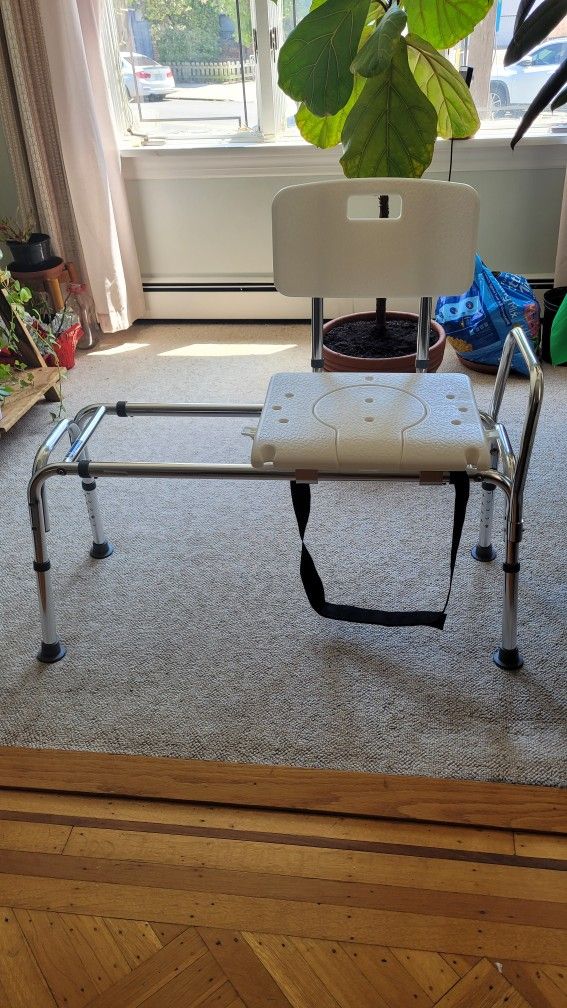 Unused brand new sliding shower chair. Will come assembled. Pick up only. About 37 inches wide, the legs come up about 16 inches.