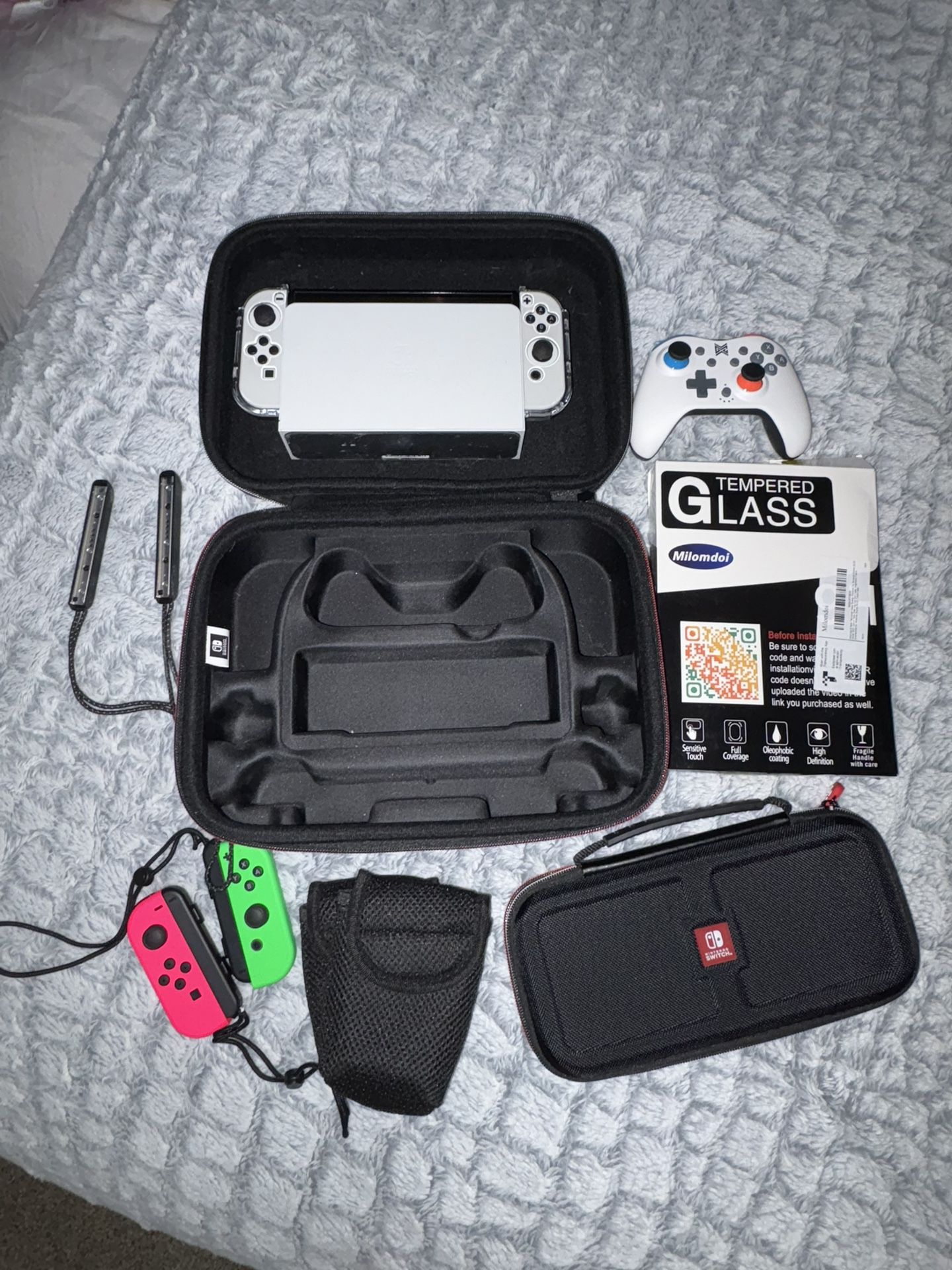 possibly open to trades. lmk what you got! Selling my Nintendo Switch OLED with Accessories Bought last year, just dont use it anymore lightly used, always in the case, joycon cases and glass screen protectors Switch OLED (with glass screen protector) switch joycon cases with grips pink and green joycons a large travel case a small travel case wireless controller extra glass protectors switch bags switch charger (not pictured since its plugged in behind the dresser) price is firm. if you have any questions feel free to reach out!