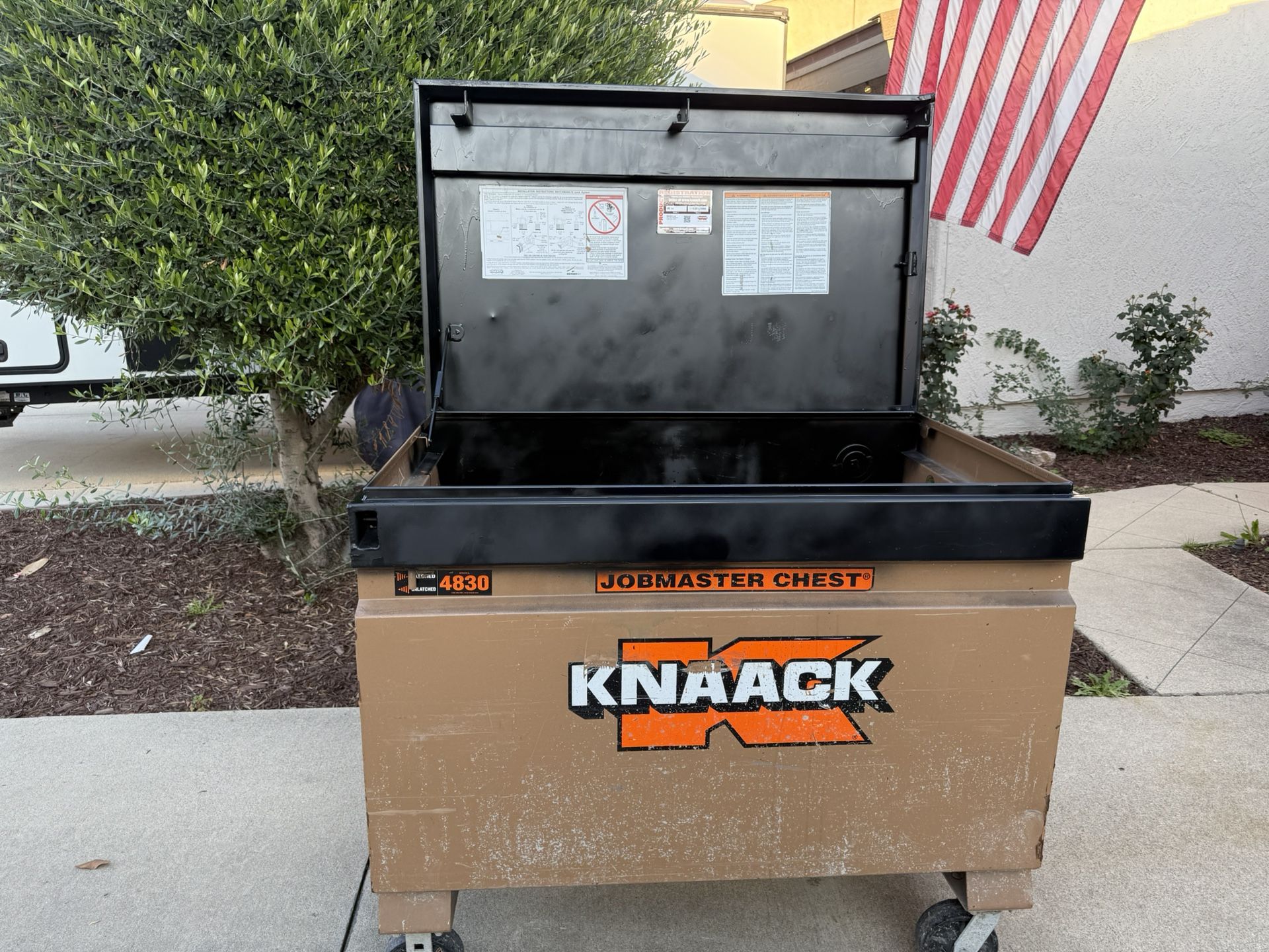 This is a Knaack Job Master Chest model 4830. In good working order ready to roll. All the mechanics on the hinge work with ease and ready to lock. Dimensions of this box are 2’6” Wide 4’ long and over all height is 3’6”.