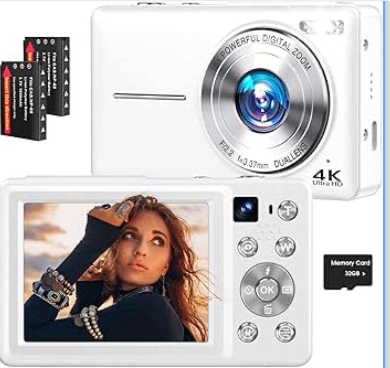 4K Digital Camera, 64MP Autofocus Vlogging Camera with Dual Lens, 16X Digital Zoom YouTube Compact Travel Point Shoot Camera for Teens Beginner, Anti-Shake,2 Batteries, 32GB Card (White)