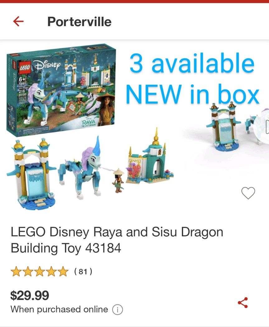 Description Excitement and mystery await Disney fans with this very different LEGO Disney Raya and Sisu Dragon (43184) set. This exciting kit includes 2 builds and plenty of accessories to spark endless play. The set also comes with printed building instructions and digital Instructions PLUS! Using the LEGO Building Instructions app, the guided real-life building process leaves even younger builders feeling like real master builders awesome! This open-ended set lets kids play how they like. They can replay thrilling scenes from the movie or dream up new ones with a detailed palace gate that has a small secret room and an opening waterfall, plus a Raya mini-doll figure and a Sisu Dragon LEGO figure. This buildable toy is ready to be brought to life by a child’s imagination and makes a unique gift that will wow everyone on the playground. It can also be combined with the LEGO Disney Raya and the Heart Palace (43181) set to create the ultimate Heart Palace