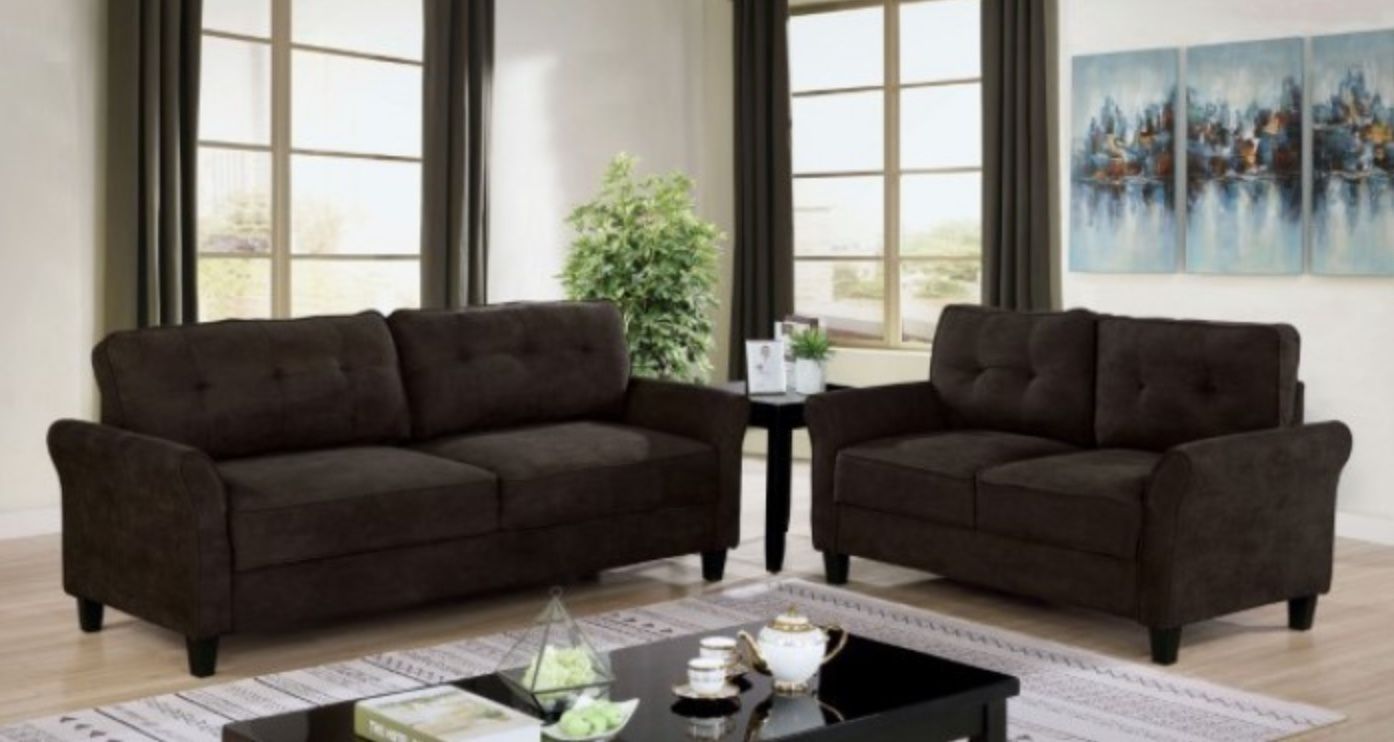 Modest Charming Brown Sofa and Loveseat with Plush Button Tufted Back, Arched Armrests, and Thick Tapered Wood Feet Dimensions: Sofa - 79”L X 30”W X 35”H Loveseat - 57"L X 30"W X 35"H Best Prices in the Industry Guaranteed! - FOA *No Tax *Pickup in Tracy by Appt *We Can Deliver