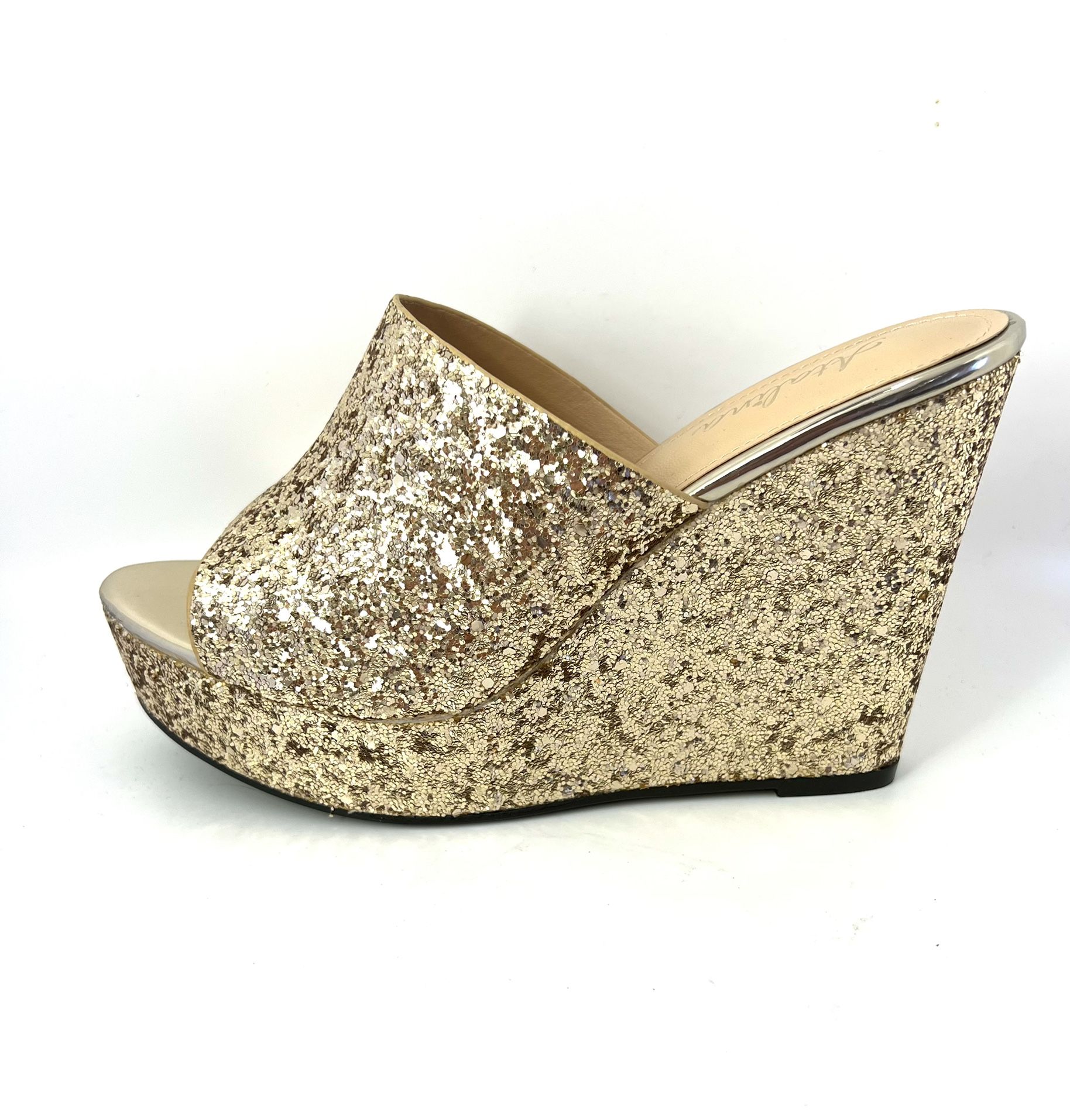 Dressy High Wedge Gold Shoes new In Box Sizes 8-9 One Size Run Small