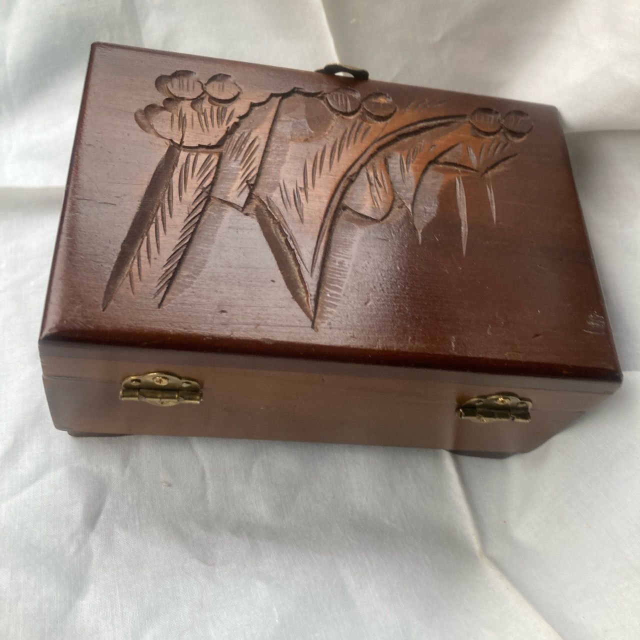 Has a nice carved wooden design bin top 6.75” x 5” x 4.5” h has a red velvet inside w/ an area for rings a nice gift no issues great condition