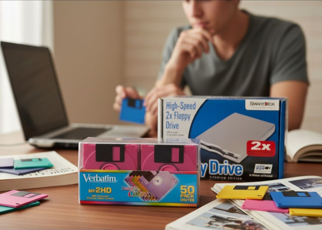 High Speed 2X Floppy Drive & 50 Pack Verbatim DataLife 1.44 MB Disks New In Box. 50 Pack Verbatim DataLife Colors MF2HD 3.5" 1.44 MB Floppy Disks New Sealed Box. This item is a SmartDisk FDUSBTM2 High- Speed 2x Floppy Drive Titanium Edition. It reads and writes standard 1.44 MB floppy disks at double the normal speed. The device is USB-powered, requiring no AC adapter. It is compatible with Windows (98SE, ME, 2000, XP) and Mac OS (8.6-9.x, X 10.1 or higher). The compact, gray design is intend- ed to match Titanium PowerBook G4 and Sony VAIO notebooks. The product is a SmartDisk High-Speed 2x Floppy Drive (Titanium Edition), an external USB-powered device designed to read and write standard 1.44 MB floppy disks at double the speed of conventional drives. Key Features. Perform- ance: Features a fast transfer rate of up to 500 Kbps and 2x read/write speeds. Connectivity: Powered entirely via USB, eliminating the need for an external AC power adapter. Compatibility: Supports older operating systems including Windows 98SE, ME, 2000, XP and Mac OS 8.6 through Mac OS X 10.1 or higher. Model Number: Often identified as FDUSB-TM or FDUSB-TM2. This item is a Verbatim DataLife Colors 3.5" 1.44 MB Floppy Disk 50-Pack. Capacity: 1.44 MB per disk, double-sided/high-density (DS/HD). Format: Pre-formatted for IBM-compat- ible systems. Design: Comes in five bright, assorted neon colors for easy color coding. Features: Includes write-on labels and utilizes low torque to reduce disk drive wear. This image shows a 50-pack of Verbatim DataLife Colors MF2HD 3.5-inch floppy disks. These are high-density (HD) disks that come pre-formatted for IBM-compatible PCs. Product Specifications. Capacity: Each disk has a standard storage capacity of 1.44 MB. Disk Type: MF2HD high-density microdisks. Format: Pre-formatted for IBM/Windows (MS-DOS).