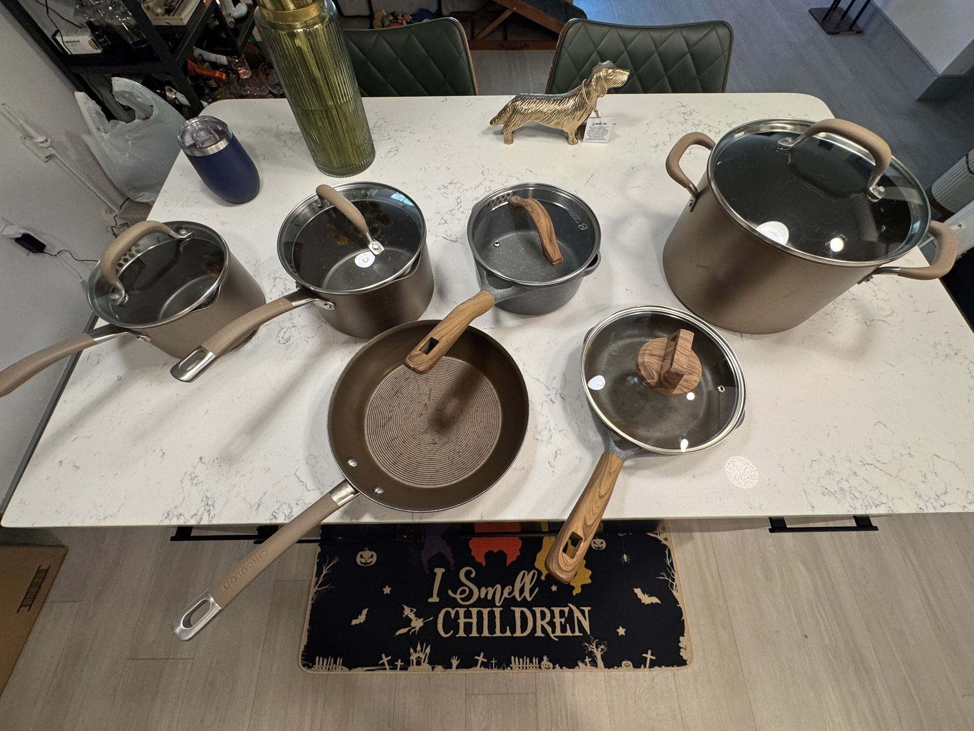 Used but in great condition Circulon premier professional series ultra non stick oven safe and dishwasher safe pots and pans with lids and 2 master class pots and pans. Pots barely used maybe once but pans have more uses and some scratches. The rest are all in new condition. 11 pieces total