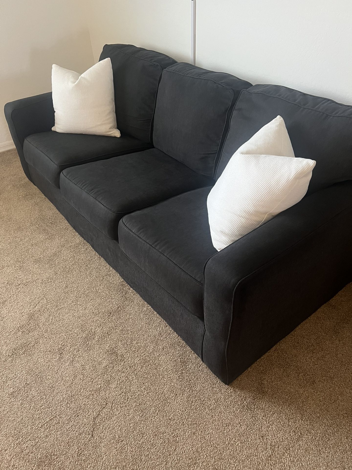 Fabric black couch Good condition Non-smoking, no pet household (Pillows not included) 82.5” wide 38” deep
