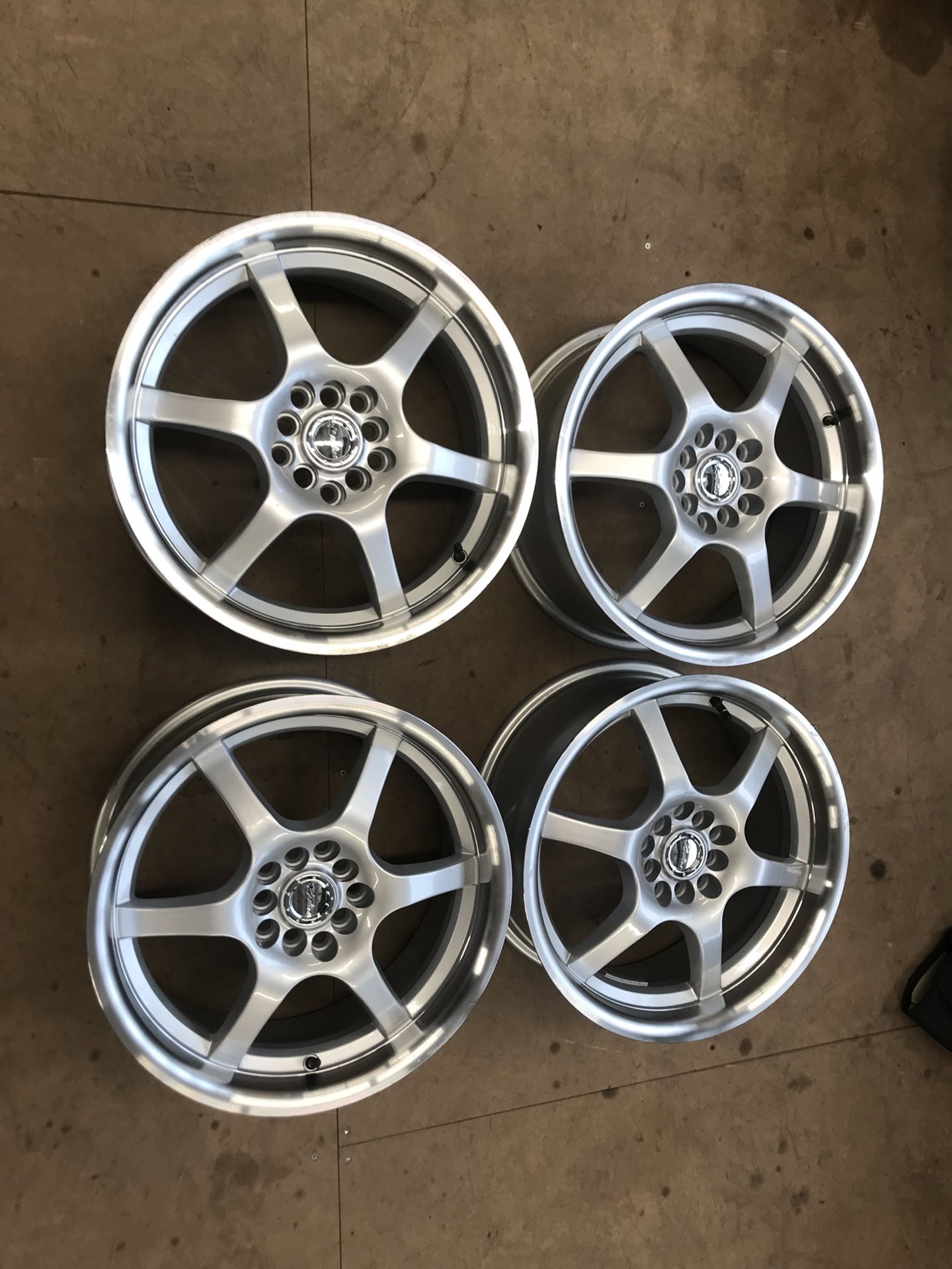 I have a set a new, 6 spoke, silver w/ chrome, Raceline wheels for sale! They’ve never been mounted on a car but have had tires mounted on them once. 126 17x7.5 5x114.3 I am selling the set of 4, for $400 obo.