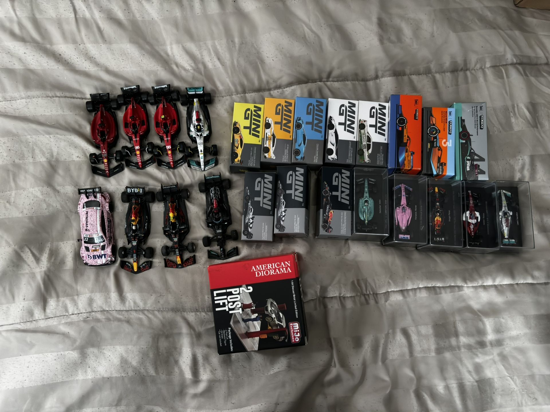 Cash only I have f1, mini gt and tarmac diecast 1/64 scale and bbruago 1/43 scale Bbruago 3 Ferrari 2 Redbull 2 Mercedes each $6 8 Mini Gt each $16 5 sparky F1 cars each $18 A 2 post lift for 1/64 scale $15 Tarmac RWB blue Porsche & 911 GT3 r each $16 3 tarmac F1 2 Daniel R McLarens 1 Merc LH each $16