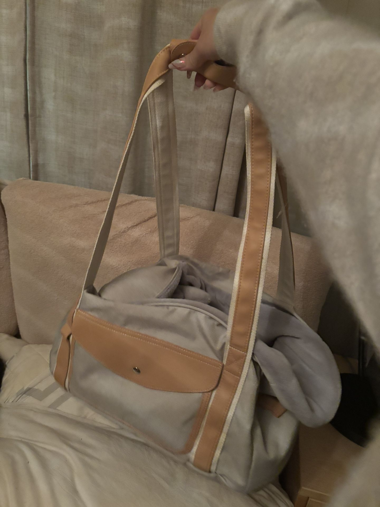 LOW PRICE MOVING- $180 + Tax Retail New Luxury Dog/cat Travel Purse Fuzzy lined Great up to 10 pounds small size Gender neutral Leather handles Gray/tan colour Asking $30 First come first serve Moving