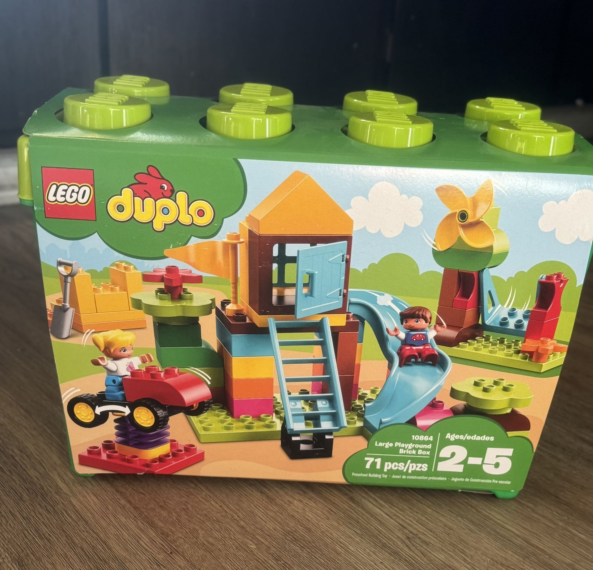 Brand new (sealed) in box Lego set. This set is retired & no longer sold in stores or online. Comes with 71 pieces, would make a great Christmas gift! Asking $45 OBO Original description: Fire your toddler’s imagination with this exciting LEGO® DUPLO® 10864 Large Playground Brick Box, designed to make an adventure playground full of fun features. This brightly colored set includes a spinning windmill, a working swing, 2 slides, a bouncy car ride on a spring and 2 DUPLO figures, so young children can build and rebuild a different playground every time. The packaging also doubles as a handy storage box. Includes 2 child LEGO® DUPLO® figures. Features a treehouse with slide, swing area with windmill and a bouncy car ride. Comes with 71 colorful LEGO® DUPLO® pieces, including a spinning windmill, working swing, hinged ladder, 2 slide pieces, bendy spring, wheelbase, door, window, shovel, flag and flowers. Encourage creativity with this versatile set of big bricks. Help your child build and play with their own LEGO® DUPLO® adventure playground. Practice role-play skills and create stories with the LEGO® DUPLO® figures. Store all your LEGO® DUPLO® pieces in the handy storage box. LEGO® DUPLO® products are specially designed to be fun and easy for small hands. Treehouse with slide measures over 7” (20cm) high, 11” (30cm) wide and 5” (13cm) deep. Swing area with windmill measures over 6” (17cm) high, 5” (14cm) wide and 2” (6cm) deep.