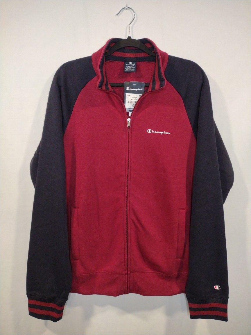 Retail $105 Champion varsity jacket. Full Zip up. Brand new with tags. Regular fit. RED / NAVY Colorway. More close to a maroon color. White Champion print logo . Two front pockets.