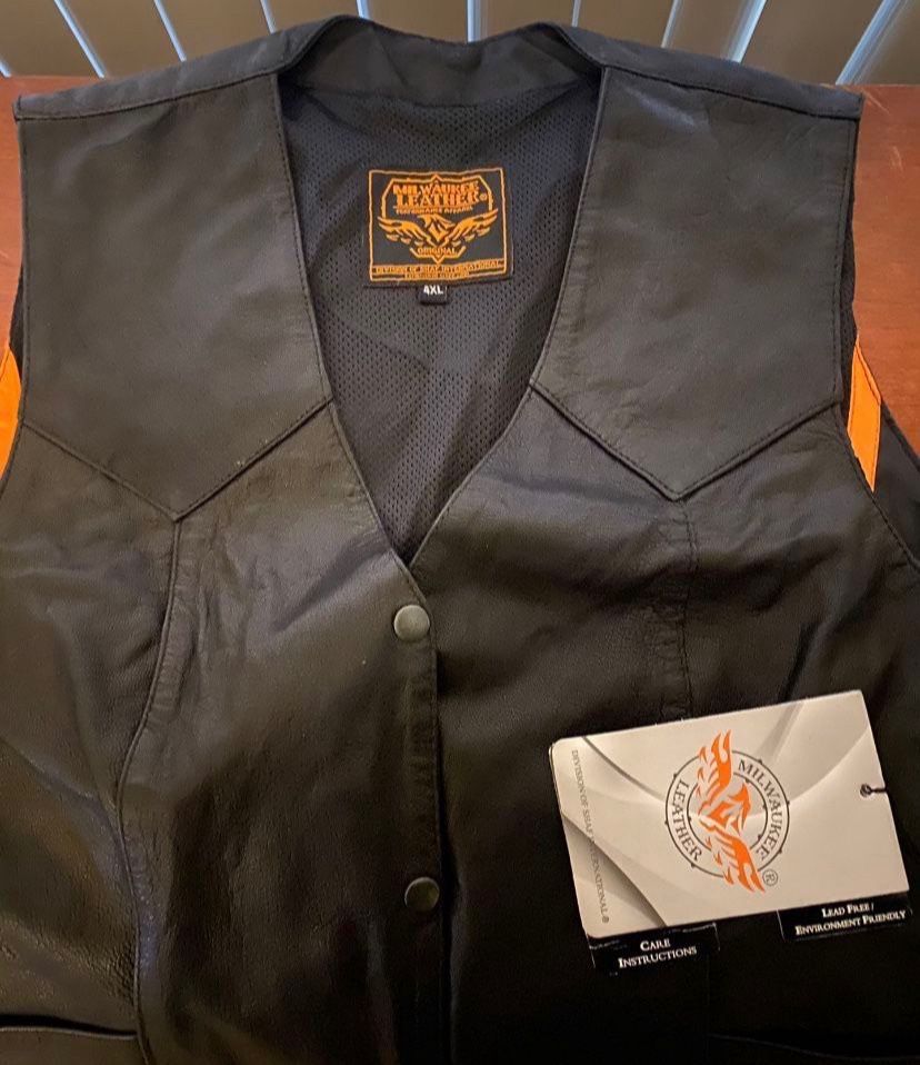 New leather vest - Motorcycle Vest Tags still attached Size 4xl 4 buttons Corset sides 2 pockets inside 2 pockets outside From Milwaukee Leather $109.99 retail + Pickup Only