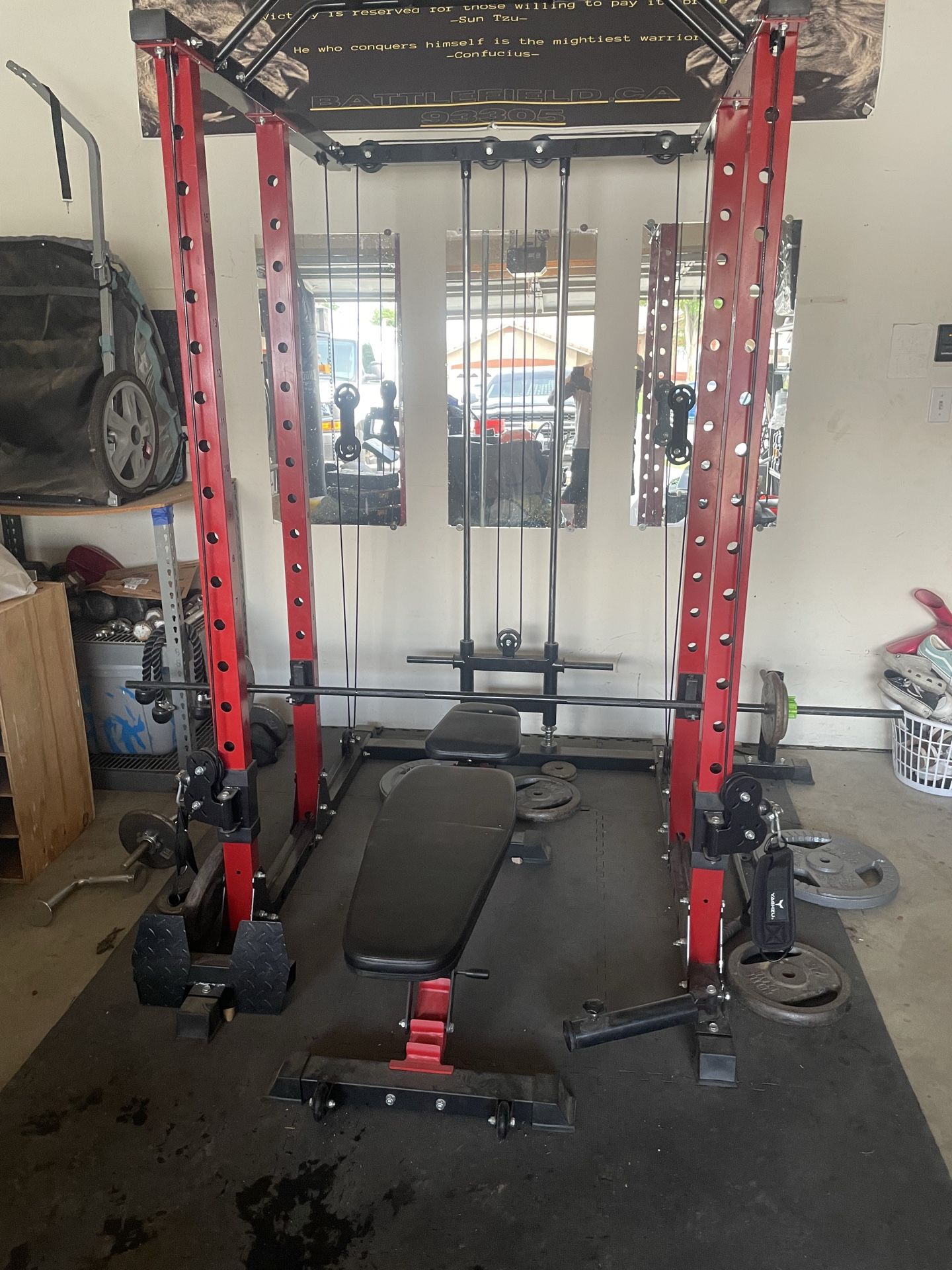 Fully functional smith machine with fly cable multiple function adjustable height dual fly cable comes with bench. And one standard bar no weights