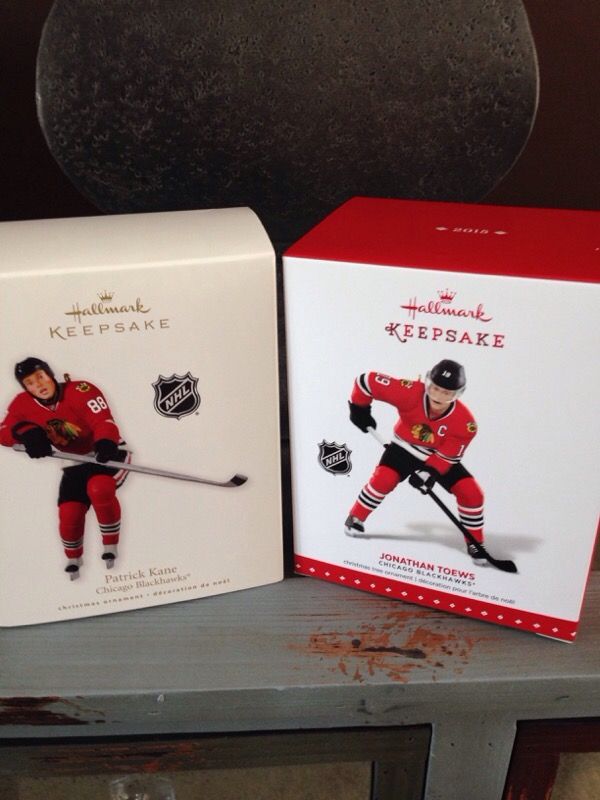 Patrick Kane(2010) and Jonathan Toews(2015) hallmark keepsake Ornaments... BRAND NEW NEVER EVEN OPENED! Sold only as a pair will NOT separate... Thank you