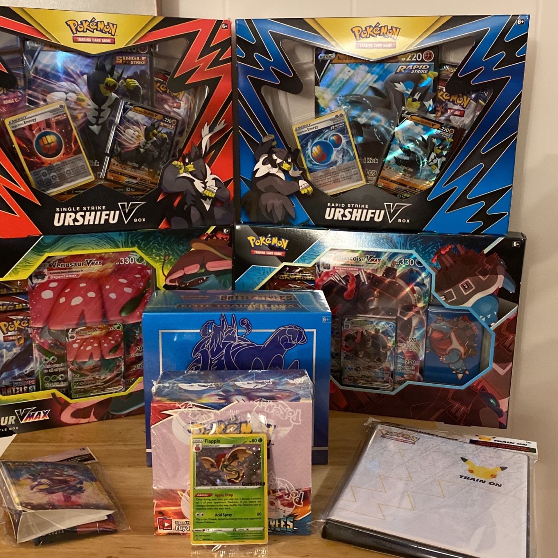 I have a couple sealed box sets prices are as follows: Urshifu box set - 35 Venusaur/Blastoise - 40 Battle style elite trainer box - 65 Battle styles boost box - 180 Pokemon binder - 15 Treasure chest set - 40 Flapple GameStop exclusive - 15 Battle style booster packs - 6 Adjusted prices accordingly. Interested in trades for Nintendo switch or older retro games. Feel free to ask questions.