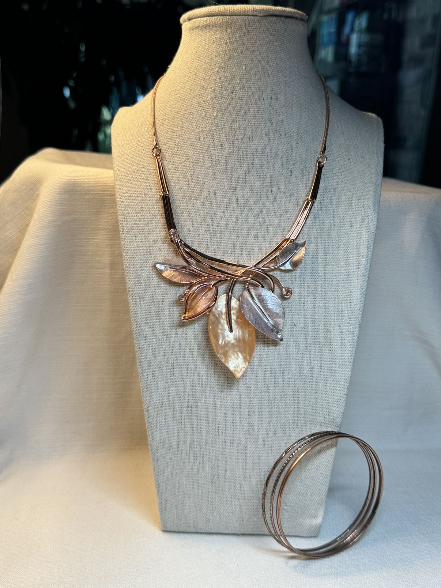 Rose Gold Tone Metal & Lucite Leaf Spray Necklace and Three Metal Rose Gold Colored Bangle Bracelets