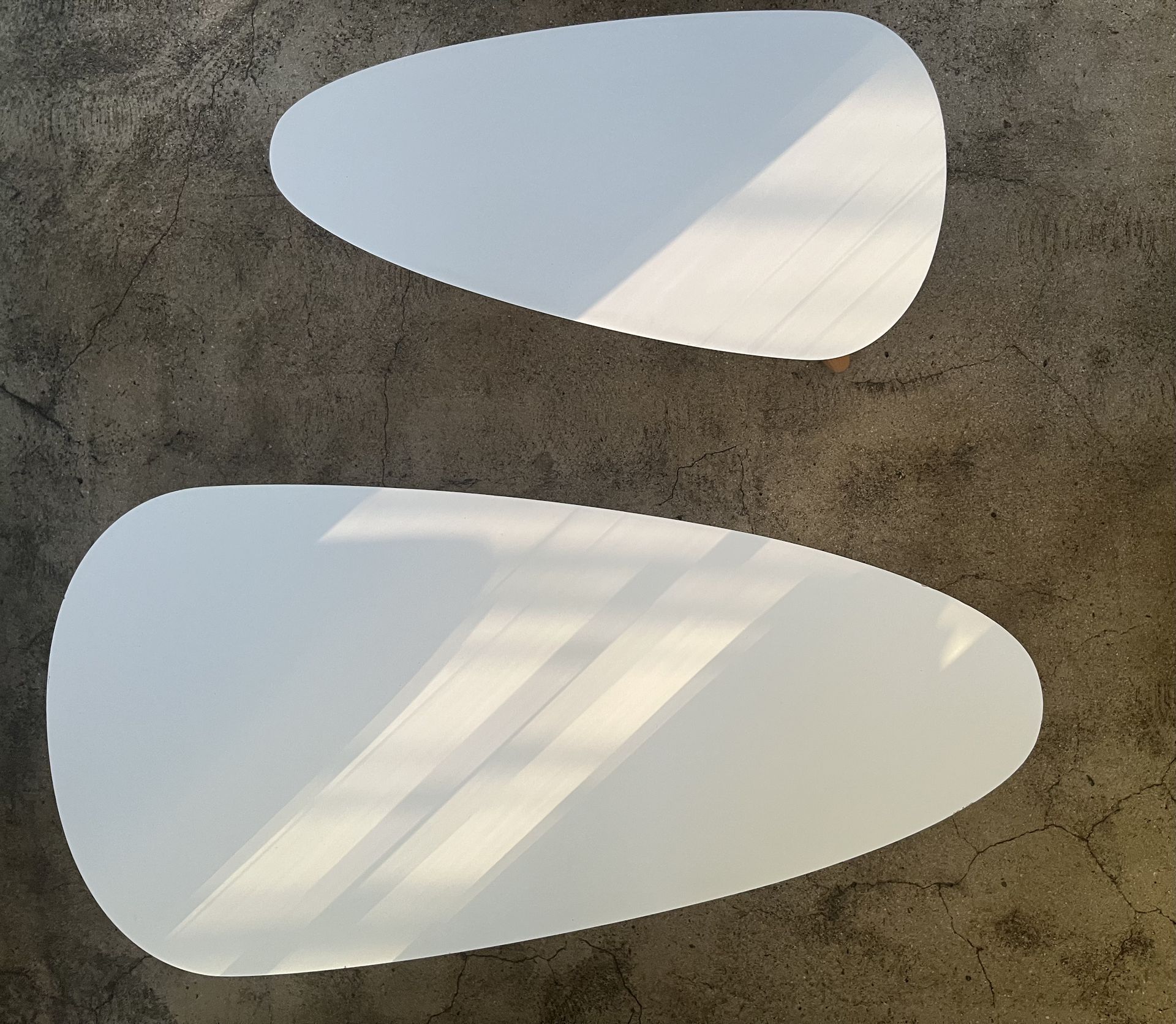 Post modern sleek set of coffee tables. One fits under the other for versatile use. Great condition. Sm table 27’’ x 14” ; 39” x 16”