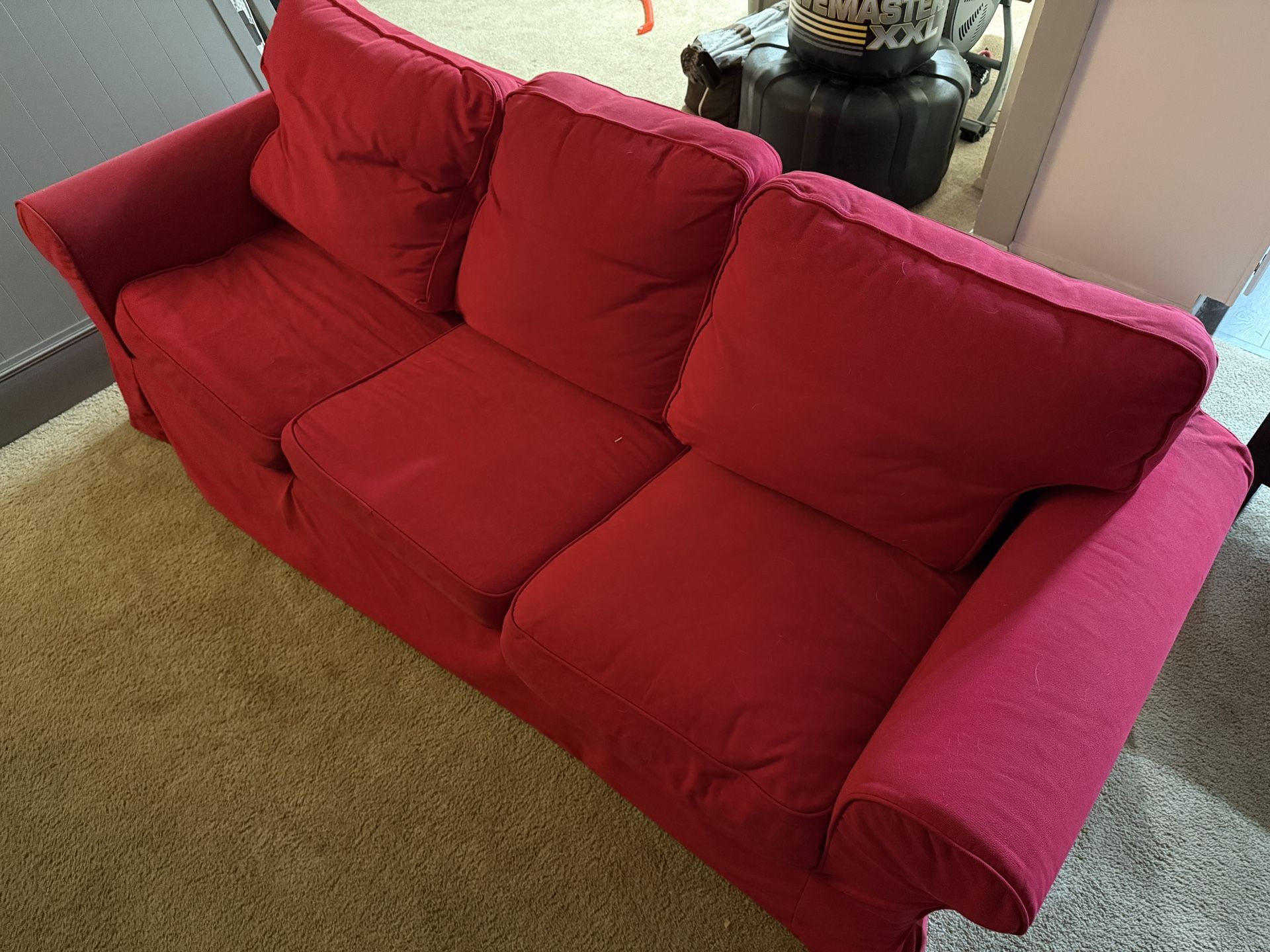 It is red but you can buy other color slip overs. It is comfortable and in good condition. It has been a second rarely used couch for us, time to go!