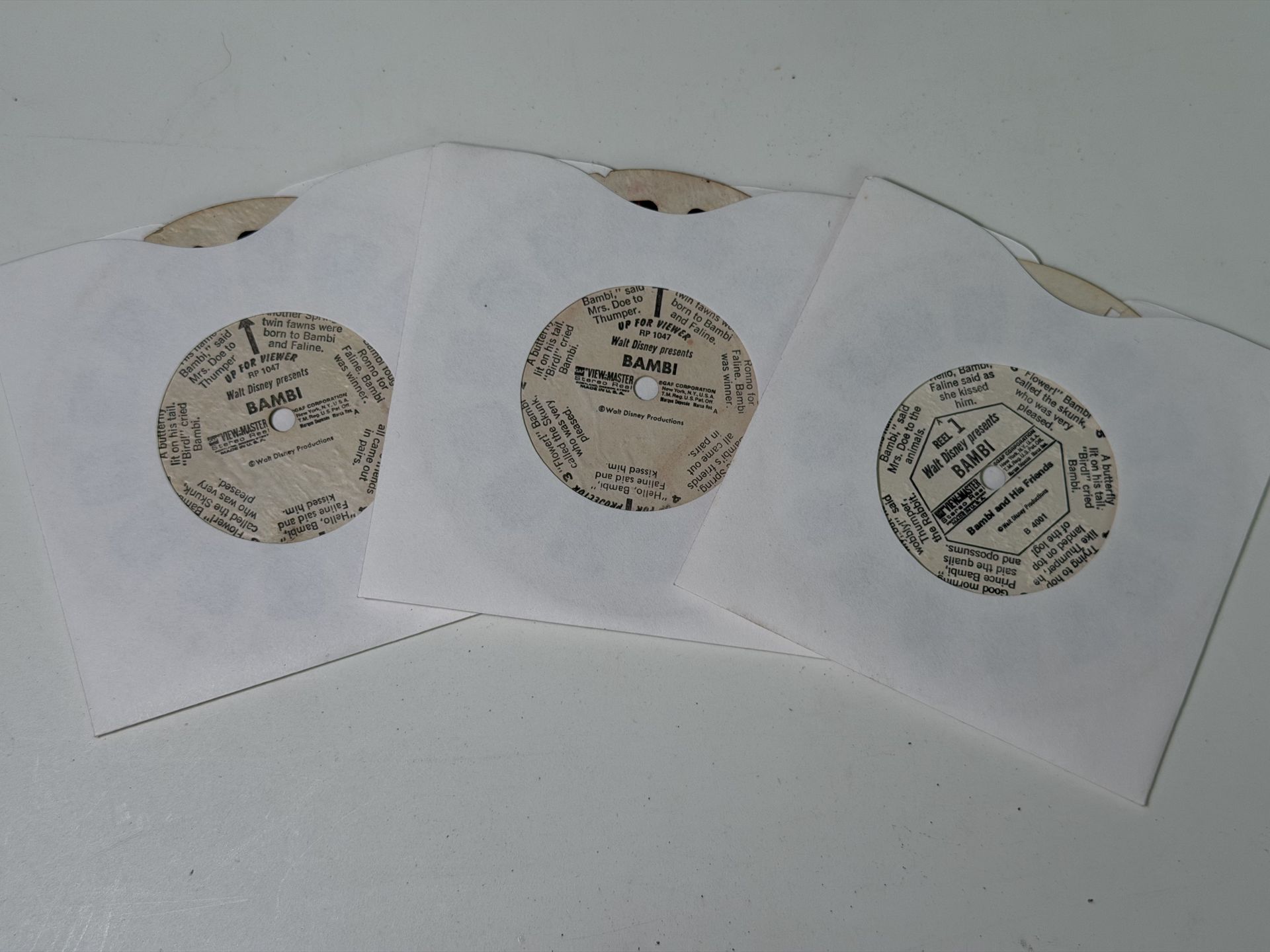 Original Walt Disney’s BAMBI View-Master 3D set. Includes 3 reels (A, B, C) featuring scenes from the classic Disney film. Marked B4001 – Bambi and His Friends. For use with standard View-Master viewer (not projector). Comes in paper sleeves. Shows vintage age wear (see photos). Great collectible for Disney fans & vintage View-Master collectors. disney bambi viewmaster, vintage 3d reel, gaf viewmaster disney, bambi and his friends, retro stereo viewer reel, classic disney collectible