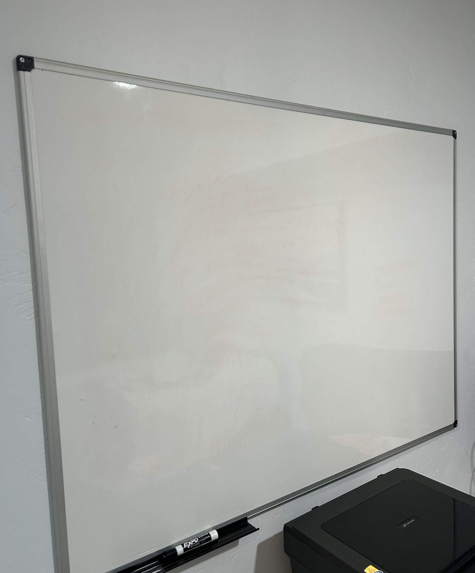 This is a solid, large-format whiteboard in great shape — writes clean and erases easily. Perfect for a home office, classroom, or creative space. What’s included: ∙ 36” x 48” dry-erase whiteboard ∙ Aluminum frame with corner brackets ∙ Bottom marker tray ∙ EXPO dry-erase chisel tip marker ∙ Wall-mounted (hardware already in place, easy to rehang) Condition: good, shows normal wear — but nothing that affects usability. Erases fully with no issues. Available for pickup in La Jolla, happy to answer any questions! 😊