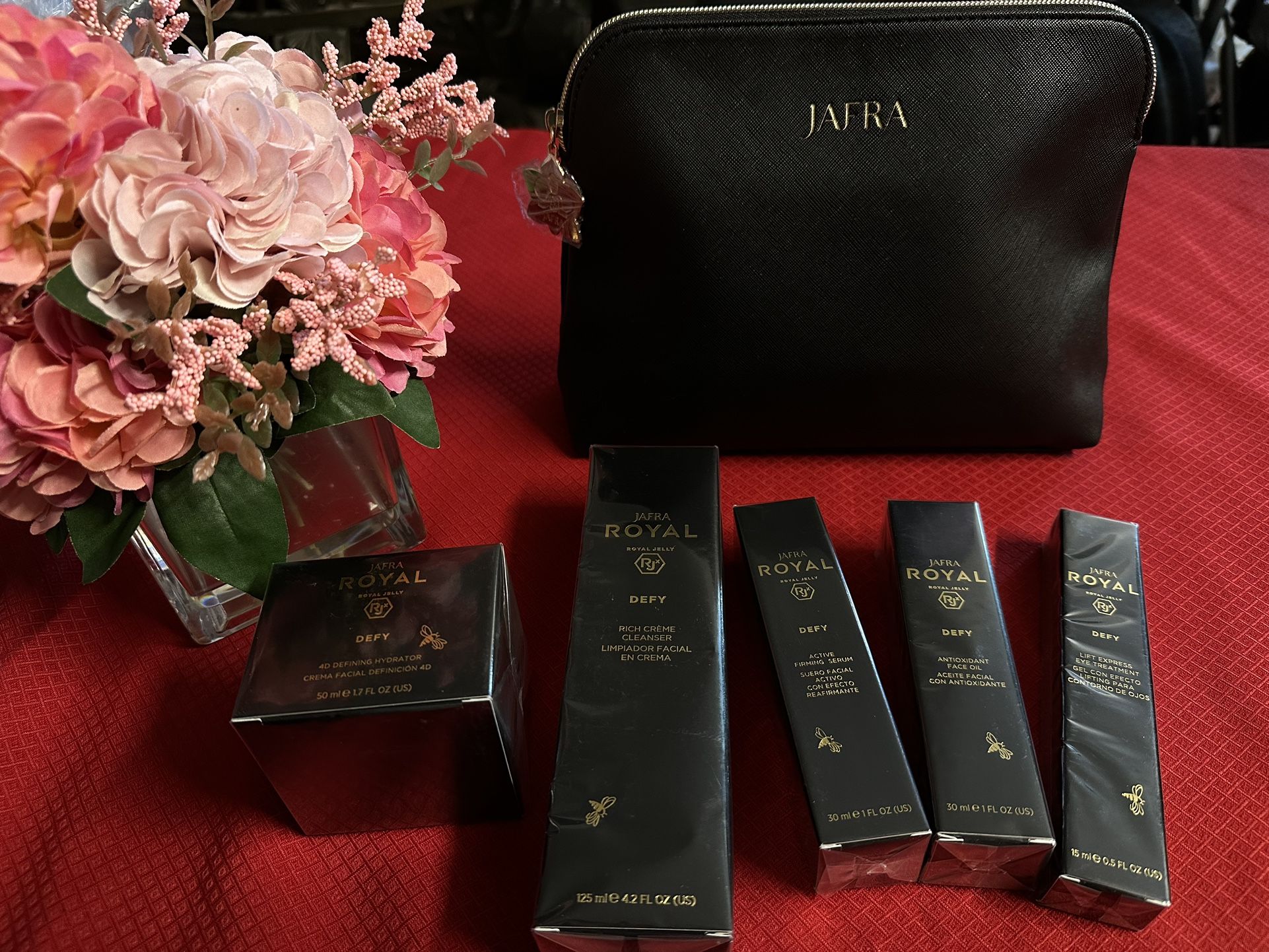 Jafra Royal Jelly defining hydrator comes with the facial cleanser • firming serum •face oil • eye lifting treatment & the jafra makeup bag Free delivery only in Victorville Area