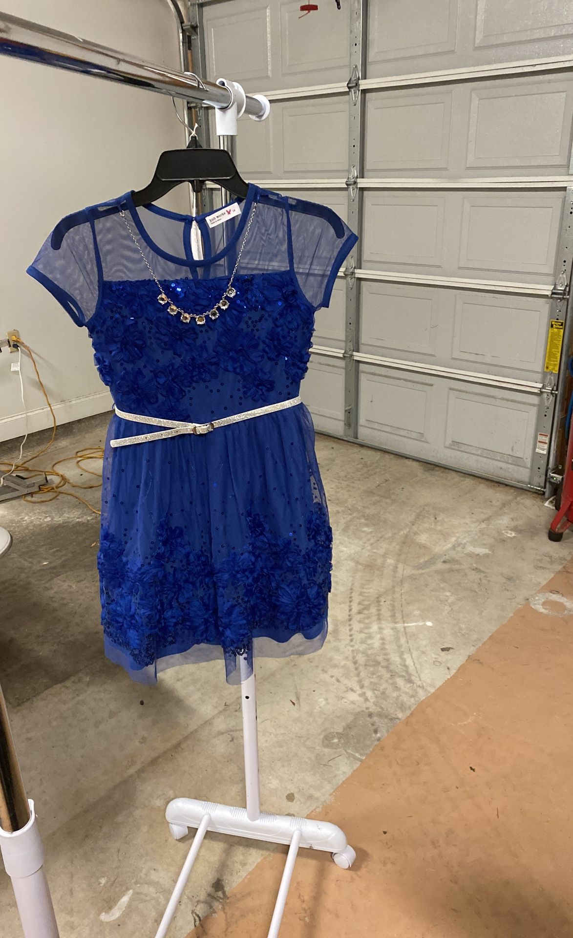 Beautiful blue dress with laced covering with flowers, with silver belt and necklace.