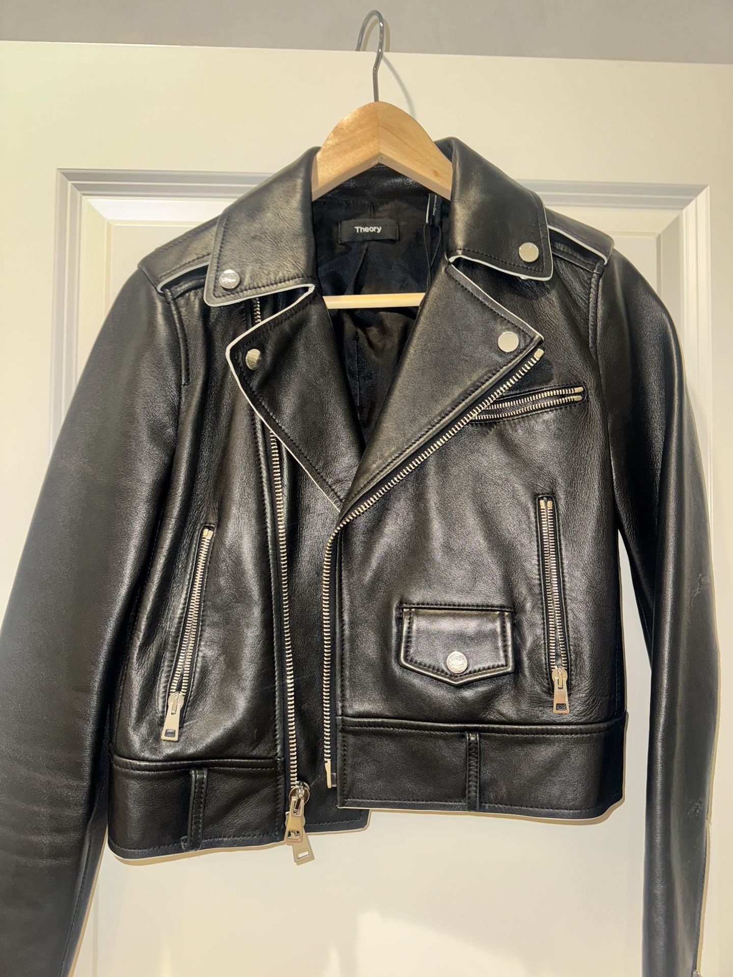 Authentic Theory black leather moto jacket. Made of real leather, not faux. • Classic biker / moto style • Silver hardware, asymmetrical zip • Zip cuffs + front zip pocket • Cropped, structured fit • Fully lined • High-quality stitching and leather finish Perfect staple jacket — timeless, edgy, and easy to style with jeans, dresses, or boots. Details • Brand: Theory • Color: Black • Material: Genuine leather • Style: Moto / biker