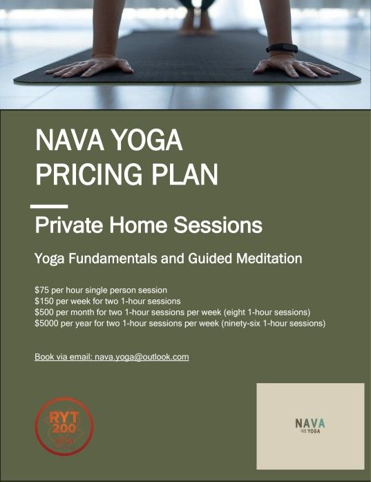 Transform Your Home into a Personal Yoga Sanctuary Discover the Benefits of Personalized Yoga with Nava नव Yoga Are you ready to experience the serenity and strength of yoga without leaving the comfort of your home? I’m a certified traveling yoga instructor dedicated to bringing the transformative power of yoga directly to you. Why Choose Home Visit Yoga? • Convenience: No need to travel to a studio. I come to you, saving you time and hassle. • Personalized Attention: Enjoy one-on-one sessions tailored to your specific needs and goals. • Comfort and Privacy: Practice in the familiarity and comfort of your own home. • Flexible Scheduling: Book sessions that fit perfectly into your busy lifestyle. Services Offered: • Private Yoga Sessions: Customized practices for individuals or small groups. • Specialized Programs: Focus on areas such as stress relief, flexibility, strength, prenatal yoga, and more. • Mindfulness and Meditation: Enhance your mental well-being with guided meditation and breathing techniques. • Workshops and Events: Host a unique yoga experience for special occasions or corporate wellness events. About Me: I am a certified RYT registered with Yoga Alliance International. I am passionate about making yoga accessible and enjoyable for everyone. Whether you're a beginner or an advanced practitioner, my goal is to help you achieve balance, strength, and inner peace through personalized yoga sessions. Book Your Session Today! Ready to start your yoga journey at home? Contact me to schedule your first session. Bring Balance to Your Life – One Pose at a Time.