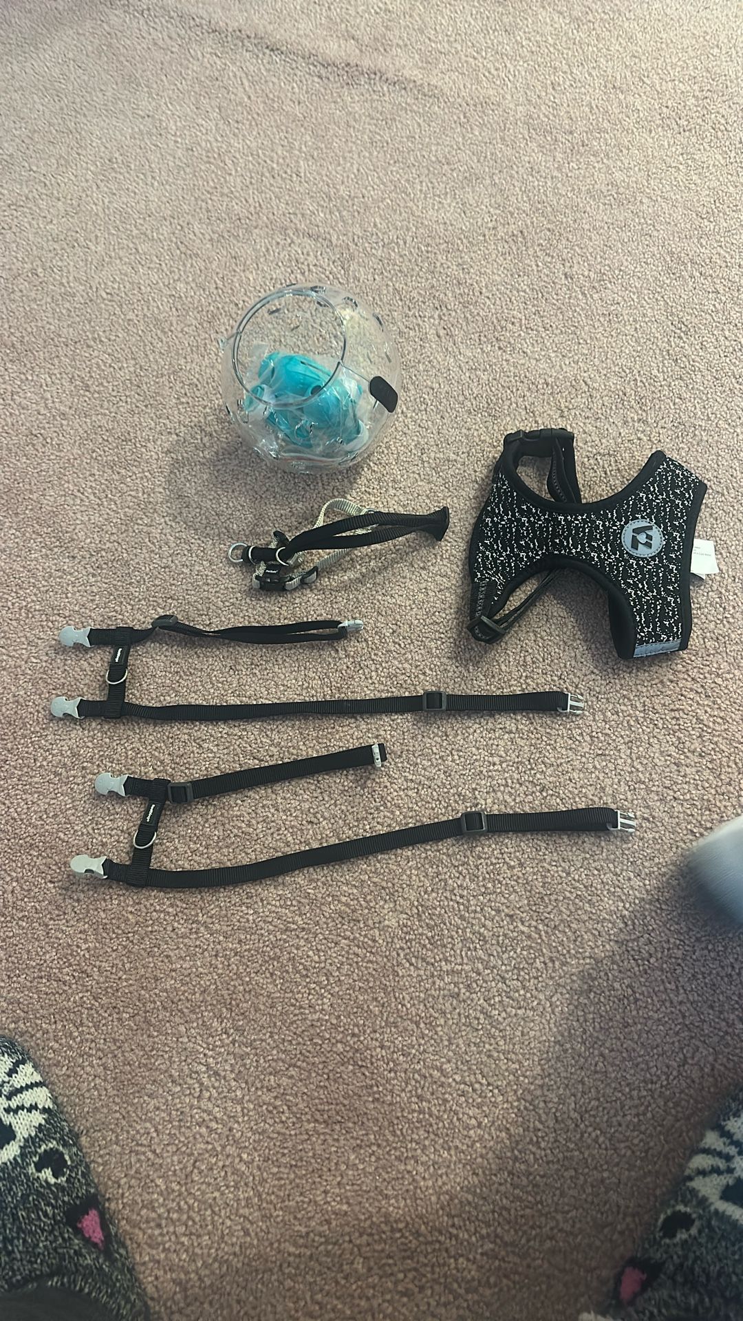 Leashes, shower cap and boots.