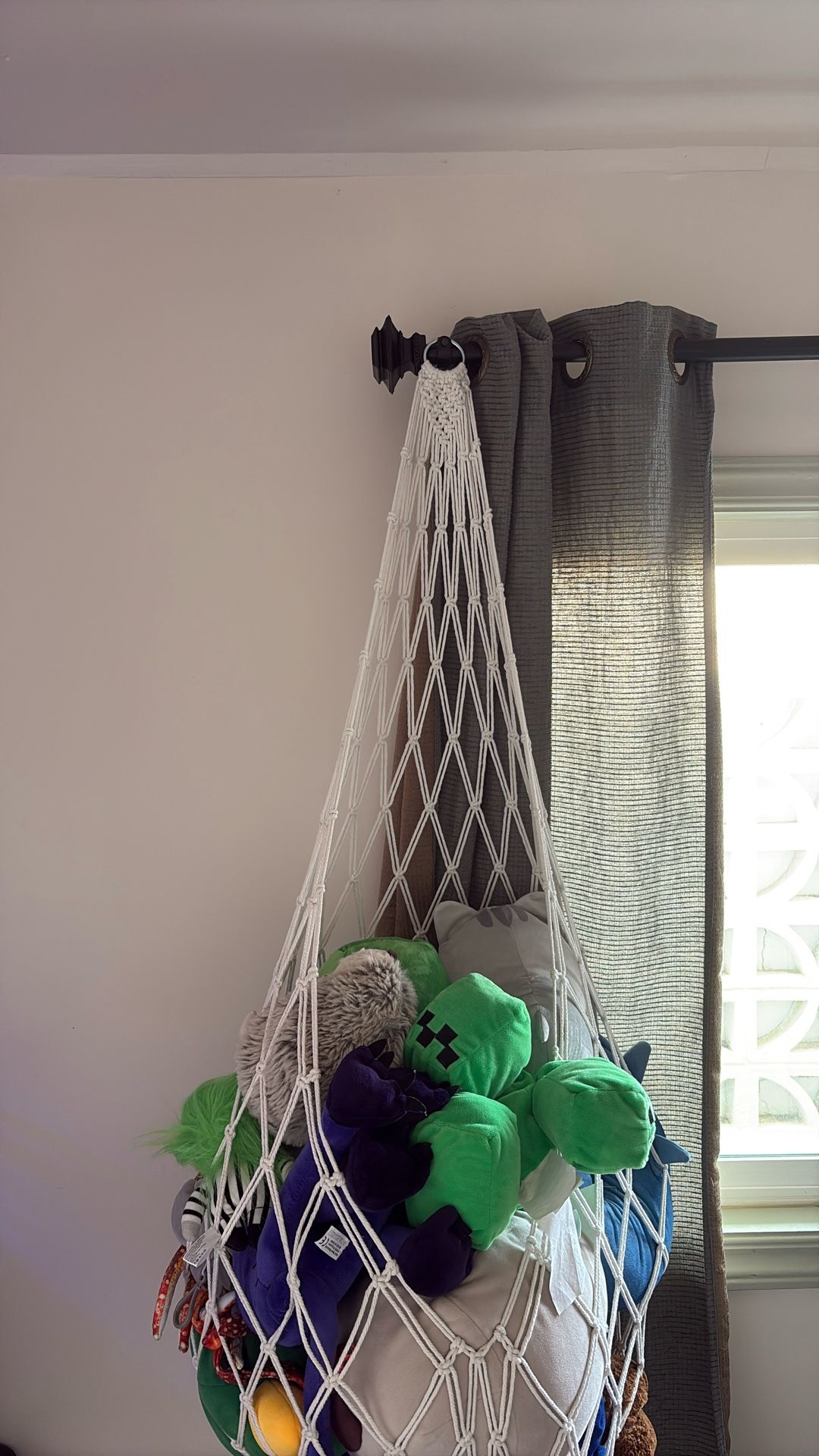 In good condition. Stuffed animals not included, just the hanging net. Used a few months. No issues. Also have hooks to attach to the wall if needed.
