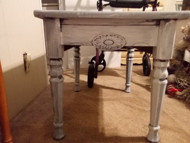 Gray and white chalk paint end table. With high gloss finish. Many hours sanding with four grit papers. 100% wood. 26in length x20inwidthx19. 5height. Beautiful for any room. Pretty carving on the sides and the legs.