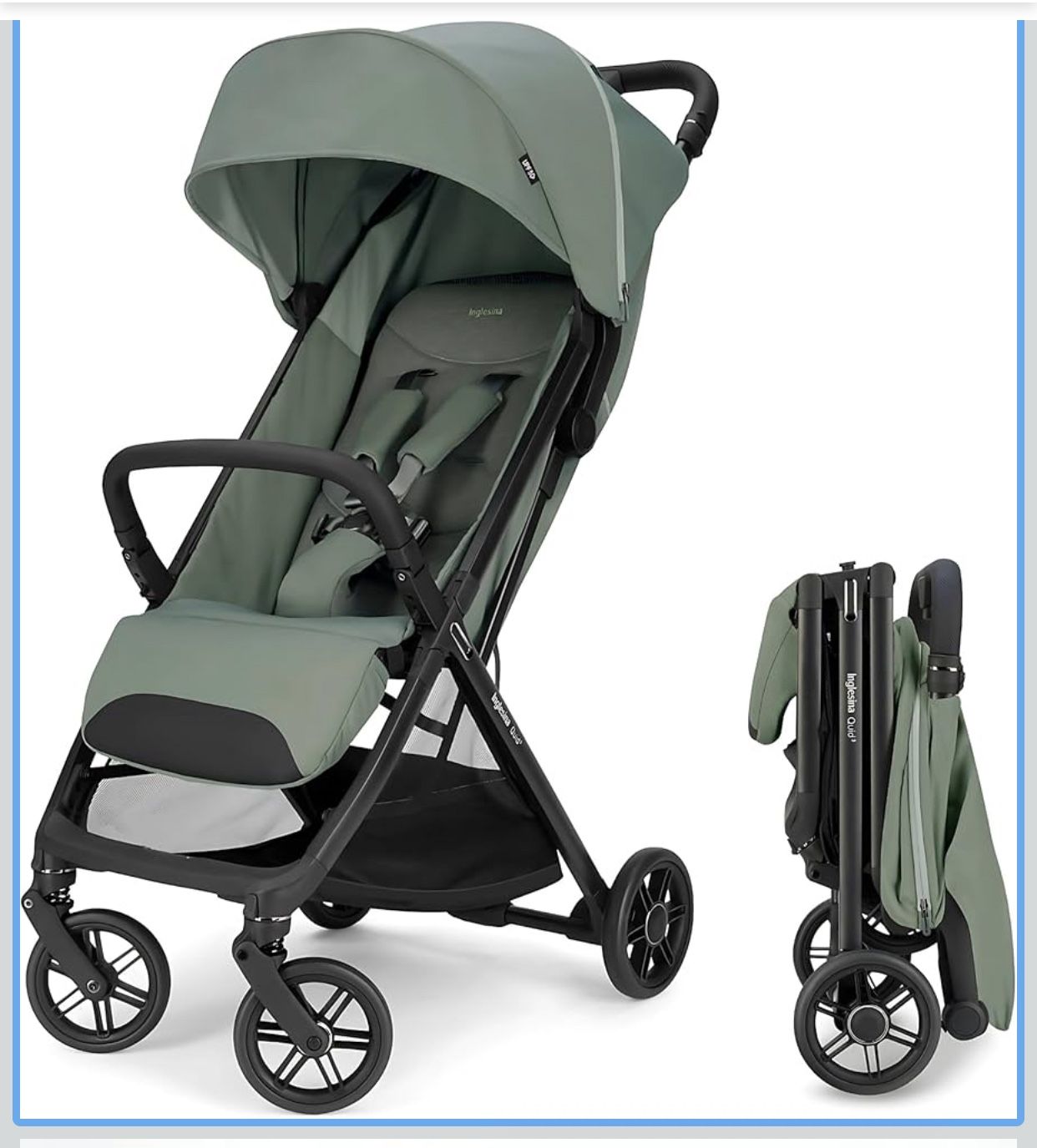 Inglesina Quid³ Stroller, Planet Green - Compact Reclining Travel Stroller for Baby & Toddler 0-55 lbs, One Hand fold, Car seat Compatible, Airplane Overhead, Lightweight, Foldable, XL UPF 50+ Canopy Location #91