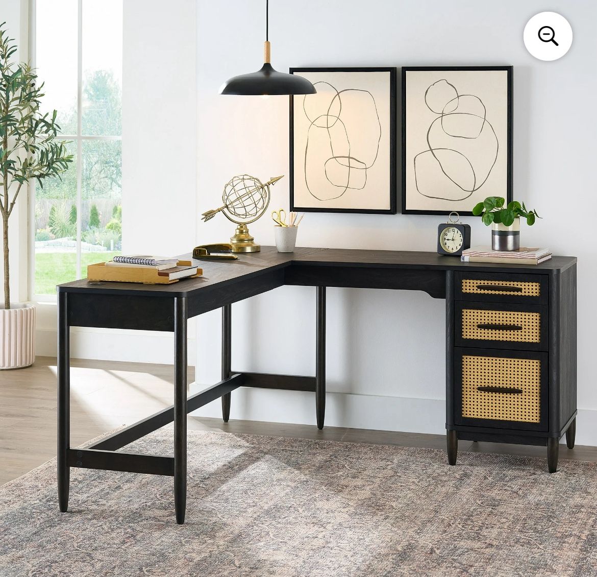 Brand new in box Have 5 available Key item features • Spacious Work Surface: Offers ample room for a laptop, lamp, and other office essentials. • Functional Drawers: Includes three drawers with full extension slides; the lower drawer accommodates letter-size hanging files. • Decorative Design: Drawer fronts feature rattan inserts, adding a touch of tropical style. • Cord Management: Desktop includes two grommet holes for electrical cord access, reducing clutter. • Versatile Placement: Finished on all sides, allowing for flexible placement in any room. • Durable Materials: Constructed with solid rubber wood accents and a charcoal finish. • Dimensions: Assembled dimensions are 60" L x 60" W x 30" H; box dimensions are 67.01" L x 21.50" W x 8.62" H.