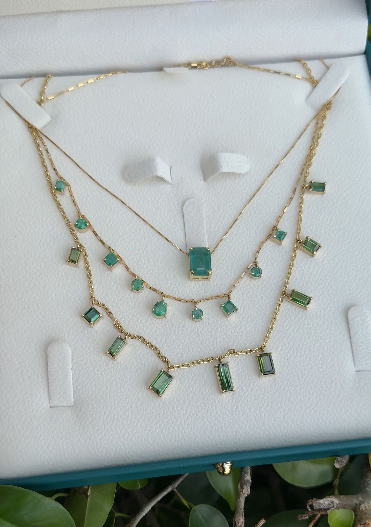 One of a kind set of luxury necklaces mounted with 18k yellow gold and natural tourmalines and emeralds. Amazing set for a special woman.