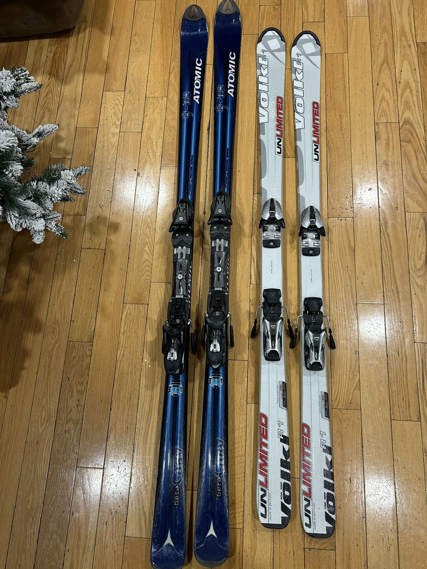 I’m selling my two skis Asking for $30- The ones on the left are a pair of 190cm Atomic Beta Carv 9.18 skis with bindings in a blue finish. I believe these came out in the early 2000s. Bought these thinking I could slap the bindings on my ski blades but I can’t so I’m selling them Asking for $70- the ones on the right are a pair of 168cm Völkl Unlimited R1 all-mountain skis with Marker Speedpoint 9.0 adjustable bindings. These are my og’s first pair. Always tuned and wax every start of the season Buy seperate or take both for $85, price is negotiable for everything