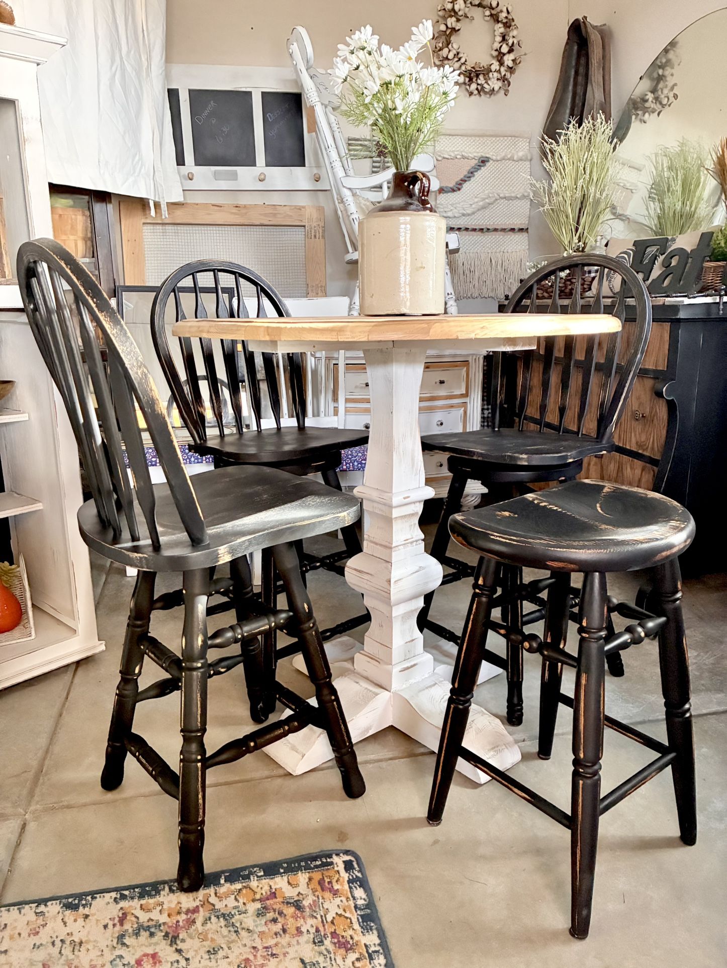 This is a smaller and taller kitchen table, measures 36” round, stands 36.5” tall and includes the 4 stools / chairs. (Can include the 3 WHITE chairs instead) Great for a small space Located in Very East Rural Parker ** Spring’n Creations LLC **