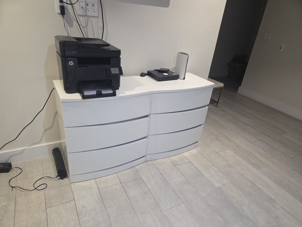 Glossy white finish, with drawers on roller tracks. Measures 16.5 x 59 x 32 high