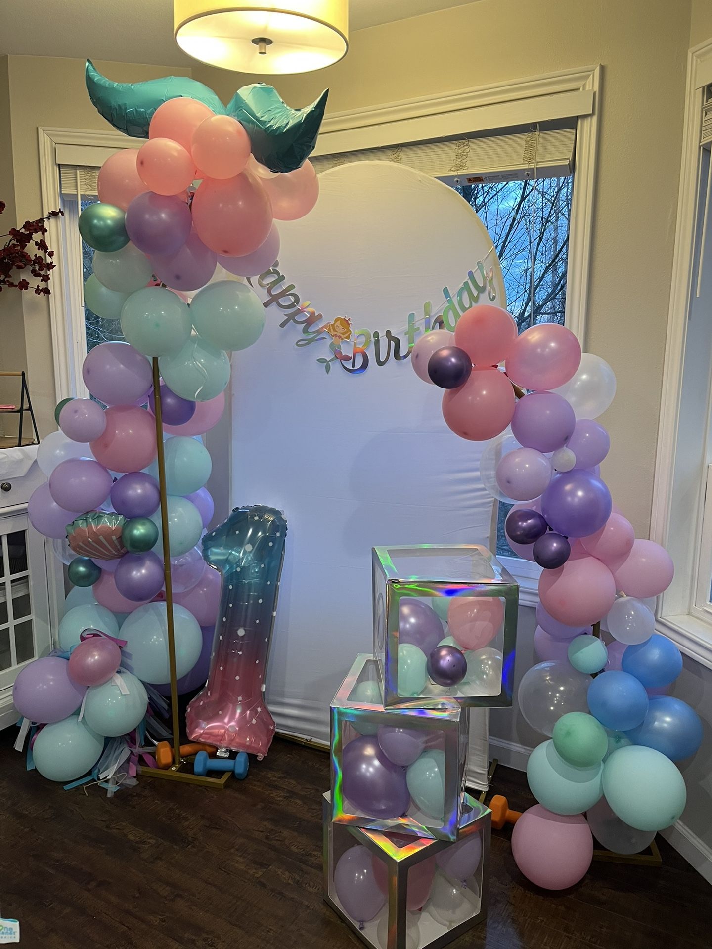Lots of mermaid decor! -Balloons for arch (comes attached on clear plastic strip, no arch metal frames/white arch cover) -Helium balloons x 4 with the weight -“Oneder the Sea” banner, happy birthday banner (pictured in balloon arch photo), and cute animal/seashell banner -Mermaid straws -2 backdrops l I’ll see if I can find anything else I can throw in! Pick up in Brier/Lynnwood. Cash or Venmo