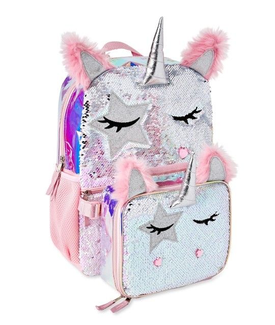 Kids New 17in laptop sleeve pink unicorn sequin kids school backpack with matching lunchbox