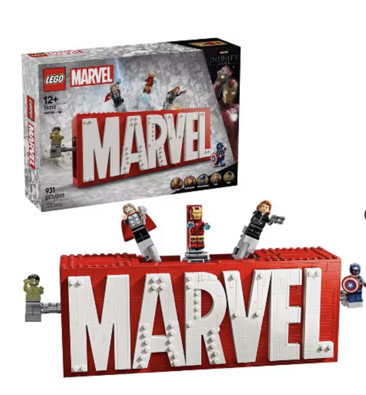 LEGO Marvel Logo & Minifigures Collectible Building Toy 76313 5 MARVEL MINIFIGURES – This buildable set contains Marvel legends Hulk, Thor, Iron Man, Black Widow and Captain America minifigures with accessories. INTERACTIVE PLAY – Kids press 3 separate buttons on the top of the Marvel model to make 5 minifigures burst out. The minifigures can quickly and easily be returned to their hidden position and the buildable playset can be reassembled. New unopened box.