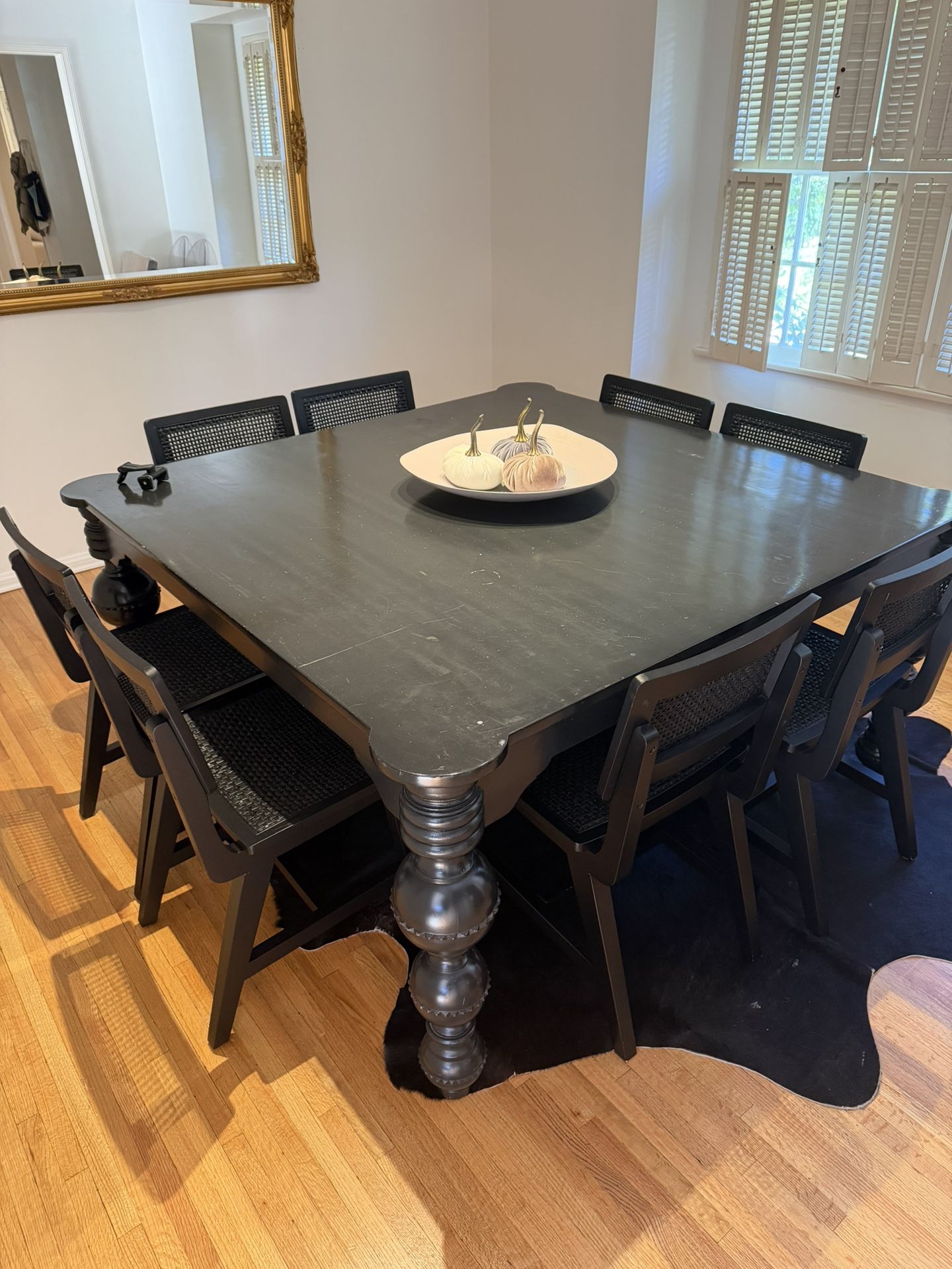 Eight person square black dining set. Chairs can be sold separately or the table Chairs: $100 each Table: $500 Whole set I’ll sell for $1100 Pick up only. Dimensions: Table - 62” wx 62” l x 30”h Chairs- 17” back , Seat 18” w, Leg Hight 18”