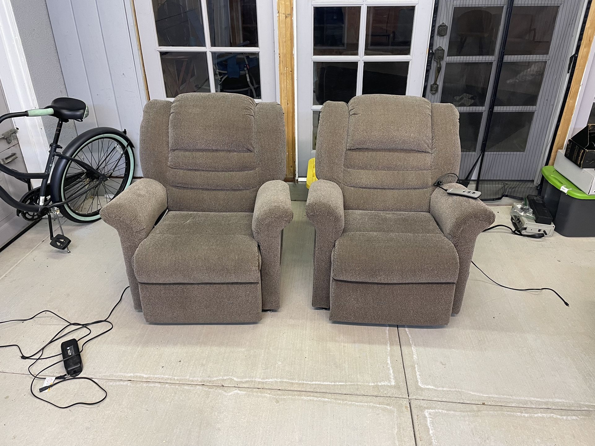 Two lift chairs for sale! Perfect for anyone who struggles to get out of a recliner - these tip forward for easy dismount onto your feet. They are both fully functioning, but I only have one plugin for both chairs at the moment.