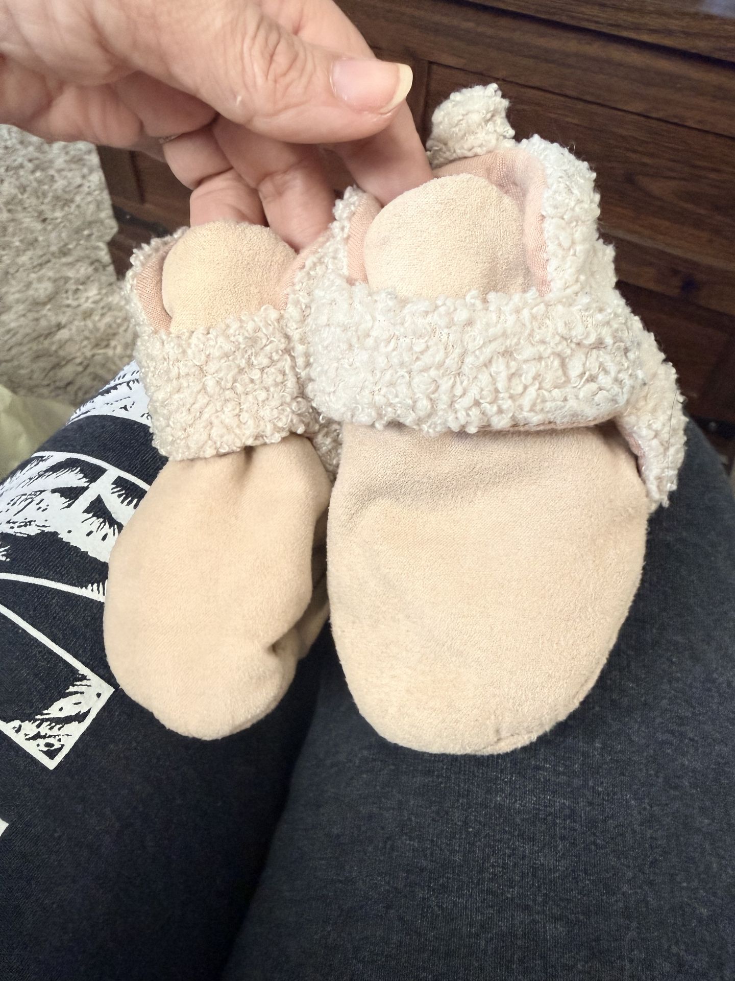 Tan pair is 3-6 month size Navy Blue/Elephant pair 12-18 month size Both in great condition and have Velcro wrap strap that keeps them on baby’s feet. $2 a pair