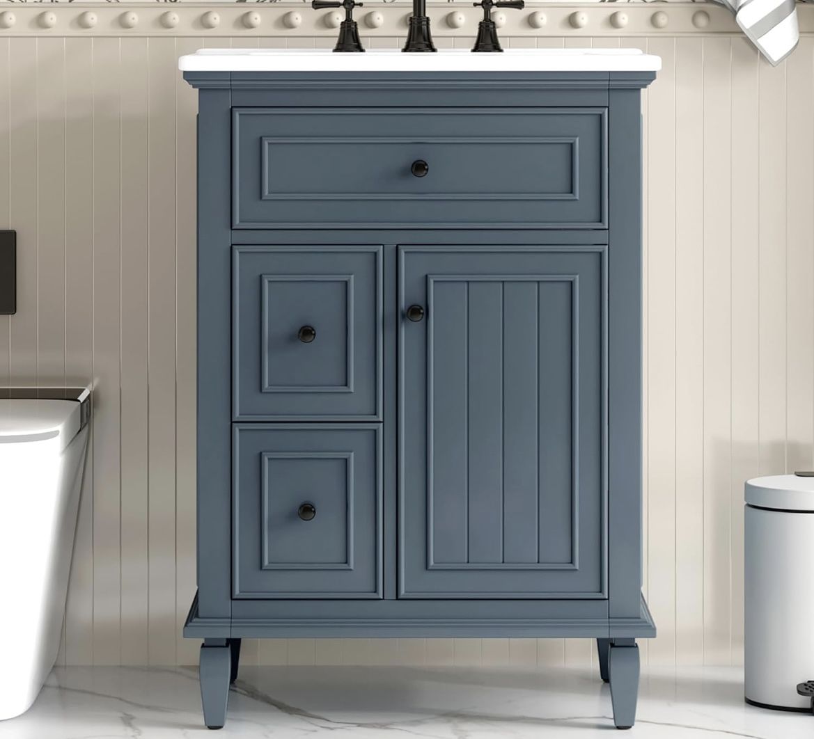Assembled New Solid Wood Frame 24” Bathroom Vanity with Ceramic Sink Storage Cabinet